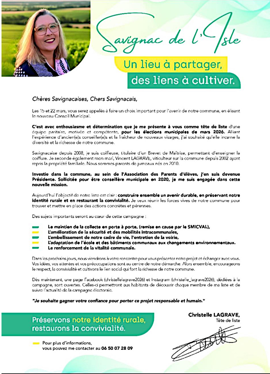 Vous pouvez consulter les sites dédiés à cette liste : Instagram : [ChristelleLagrave2026] Facebook : [Christelle Lagrave 2026] Facebook : [Info Savignac (groupe privé)] |