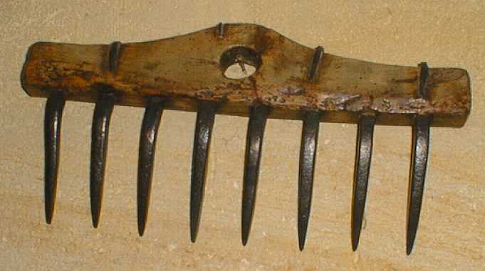 | Outils à casquer le blé ou casquoire. Dans ce cas précis le blé était cultivé en sillon dans des joualles [1]. | Joug à vigne : il est raccourci pour ne pas accrocher les piquets. | Fend vime (osier) pour attacher et plier lavigne, également pour lier les sarments. | |