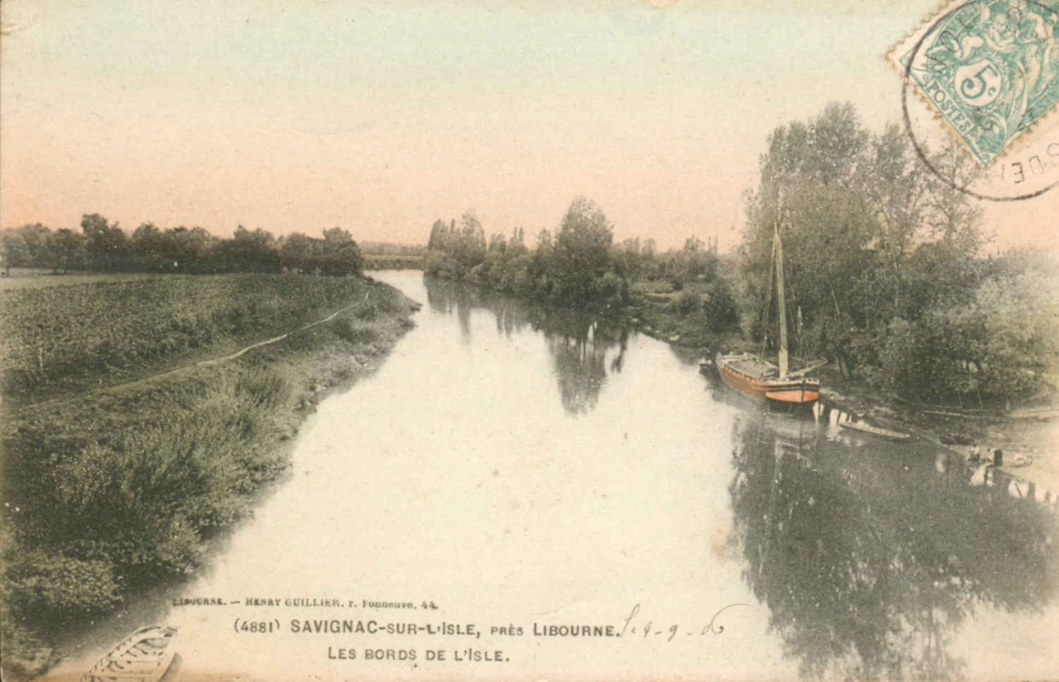 Cette carte postale date du tout début du XXme siècle. À droite au premier plan, le port de Savignac où on distingue des lavandières venues avec leur brouette et leur planche à laver. On voit une gabarre avec voile, amarrée au rivage.
